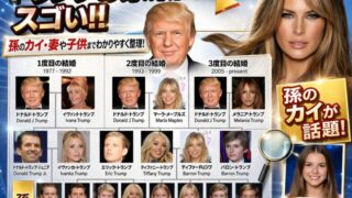 トランプと19人の血が繋がっている‼︎ドナルド・トランプさんは3人の妻がいて、子供は5人、さらに孫は11人いるため、家系図がスゴいと話題です。最近は特に孫娘のカイ・トランプさんに注目が集まっています。この記事では、複雑に見えるトランプ家の関...